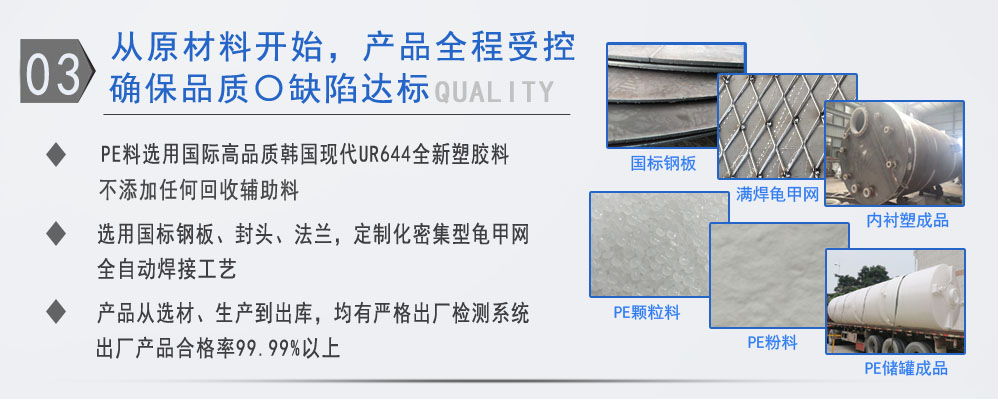 公司有鋼襯塑PE/PO、PE全塑、碳鋼、不銹鋼四大系列100多個品種,專注于常壓儲存容器生產(chǎn),其產(chǎn)品包括鋼襯塑儲罐、管口一體成型PE儲罐碳鋼儲罐不銹鋼儲罐、反應(yīng)釜、攪拌罐、離子交換柱、鋼襯PE/PO儲罐、塑料儲罐、鹽酸儲罐、硫酸儲罐等等。更大限度滿足廣大客戶的各種需求,同時可以根據(jù)客戶的需要加工定制各種防腐設(shè)備。